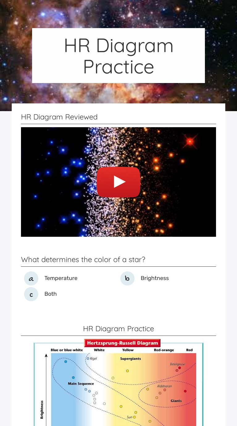 Answers To Student Exploration Hr Diagram Gizmo Author: randomchaos.com-2022-01-21T00:00:00+00:01 Subject: Answers To Student Exploration Hr Diagram Gizmo Keywords: answers, to, student, exploration, hr, diagram, gizmo Created Date: 1/21/2022 12:51:16 AM Student Exploration: H-R Diagram (ANSWER KEY) · Start by moving your cursor over the stars in the Star collection.Information about each star is displayed on the right side of the Gizmo. The numbers given for Luminosity, Radius, and Mass are in comparison to the Sun. So, a star with a radius of 2 is twice as large as the Sun.